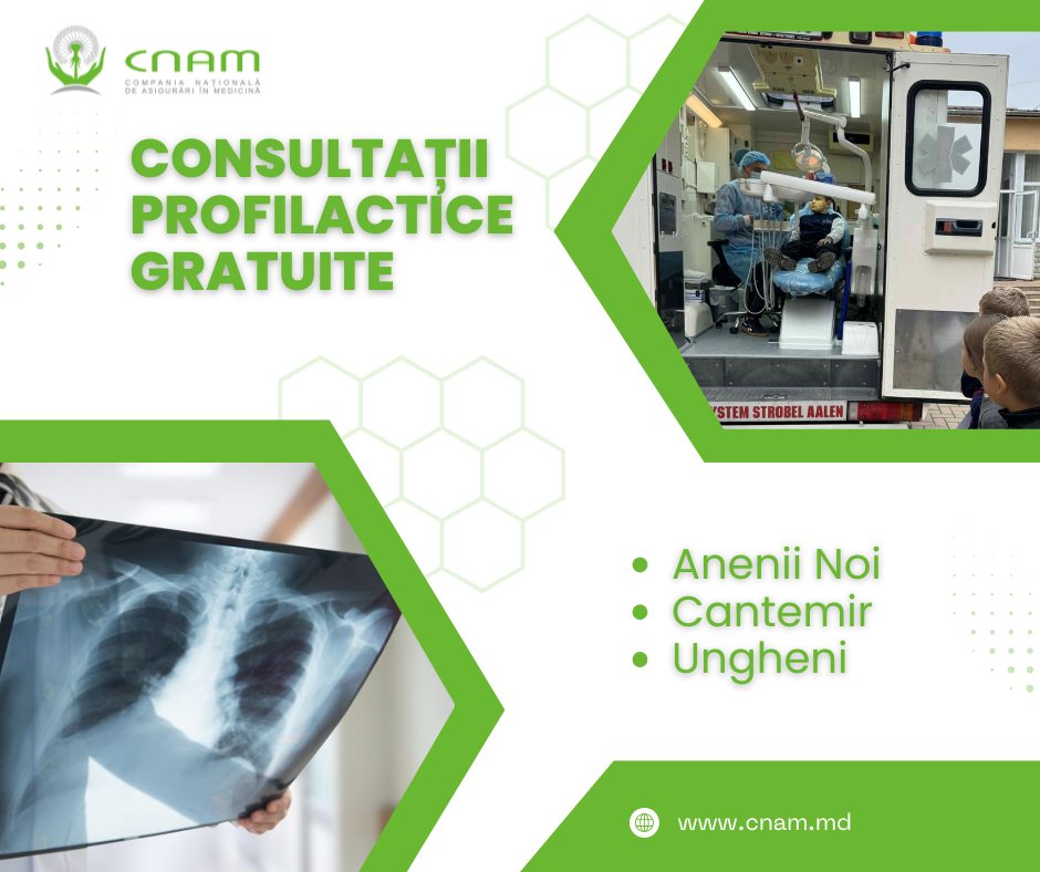 Echipele mobile de medici specialiști vor oferi populației din raioanele Ungheni, Anenii Noi și Cantemir consultații profilactice gratuite, acoperite din mijloacele financiare ale fondului măsurilor de profilaxie al Companiei Naționale de Asigurări în Medicină (CNAM), comunică MOLDPRES.