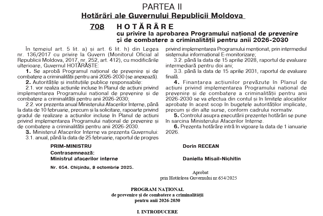 Hotărârea cu privire la aprobarea Programului național de prevenire și de combatere a criminalității pentru anii 2026-2030 va intra în vigoare la 1 ianuarie 2026.