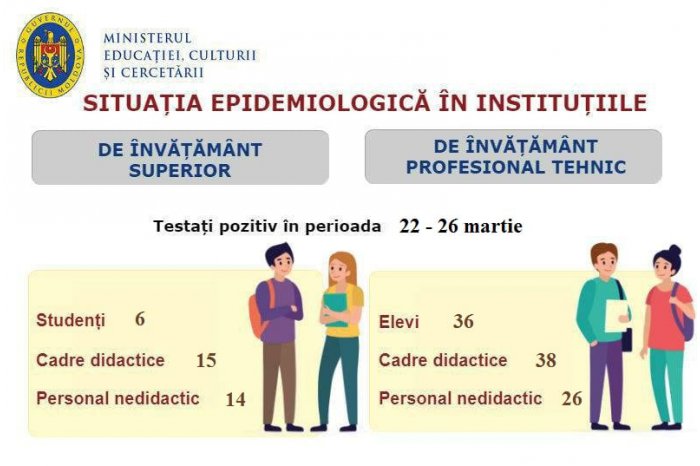 În perioada 22-26 martie, în instituțiile de învățământ superior au fost confirmați pozitiv șase studenți, 15 cadre didactice și 14 cadre auxiliare, iar în autoizolare au fost plasați un student, șapte cadre didactice și 12 cadre auxiliare. În învățământul profesional tehnic, în perioada 22-26 martie, au fost confirmați pozitiv cu virusul Covid-19, 36 de elevi, 38 de cadre didactice și 26 de persoane alte categorii de personal.