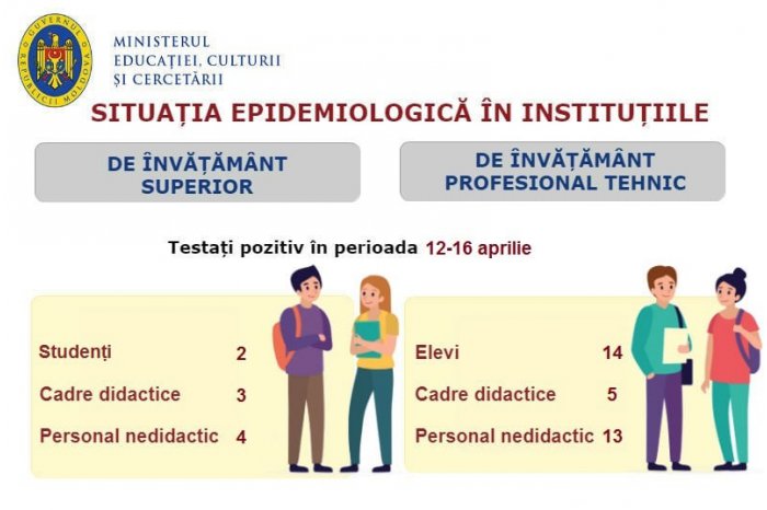 În perioada 12-16 aprilie, în instituțiile de învățământ superior au fost confirmați pozitiv doi studenți, trei cadre didactice și patru cadre auxiliare, iar în autoizolare au fost plasate două cadre didactice. În învățământul profesional tehnic, au fost confirmați pozitiv cu virusul Covid-19, 14 elevi, cinci cadre didactice și 13 alte categorii de personal.