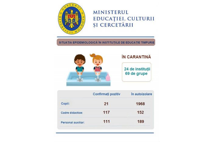 Potrivit ministerului de resort, în învățământul de educație timpurie, 24 de grădinițe și 69 de grupe de copii se află în carantină. Copii confirmați pozitiv cu virusul COVID-19 sunt 21, iar alți 1968 se află în autoizolare. 117 cadre didactice au fost confirmate pozitiv cu noul Coronavirus, în autoizolare se află 152. Din personalul nedidactic și auxiliar au fost infectate cu noul virus 111 persoane, iar alte 189 se află în autoizolare.