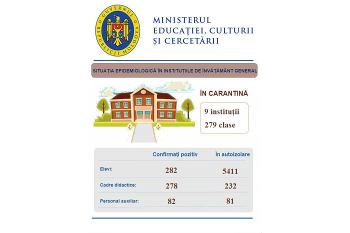 Potrivit ministerului, 278 de cadre didactice au fost confirmate pozitiv cu noul coronavirus și 232 se află în izolare. Din personalul nedidactic și auxiliar au fost infectate cu noul virus 82 de persoane, iar alte 81 se află în autoizolare.