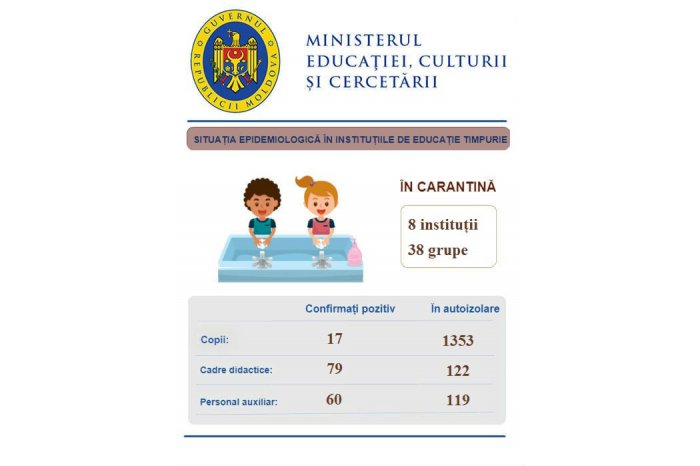 În învățământul de educație timpurie, opt grădinițe și 38 grupe de copii se află în carantină. Copii confirmați pozitiv cu virusul COVID-19 sunt 17, iar alți 1353 se află în autoizolare. 79 de cadre didactice au fost confirmate pozitiv cu noul coronavirus, în autoizolare se află 122. Din personalul nedidactic și auxiliar au fost infectate cu noul virus 60 de persoane, iar alte 119 se află în autoizolare.
