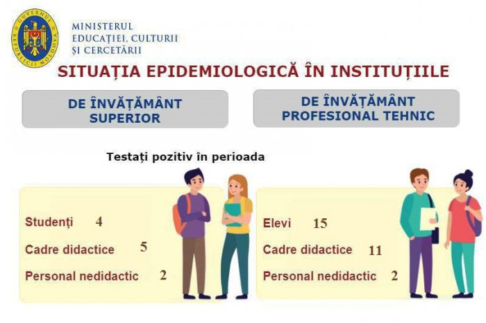 „În învățământul profesional tehnic, în perioada 25-29 ianuarie, au fost înregistrați 15 elevi testați pozitiv cu virusul Sars-Cov-2, 11 – cadre didactice și 2 din personalul nedidactic și auxiliar. De asemenea, 17 grupe de elevi sunt plasate în autoizolare”, indică MECC.