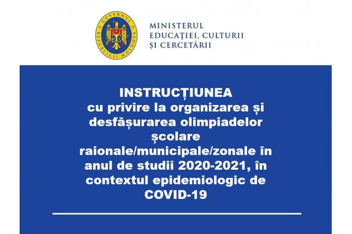 Chişinău, 24 feb. /MOLDPRES/. Ministerul Educației, Culturii și Cercetării (MECC) a prezentat astăzi Instrucțiunea cu privire la organizarea și desfășurarea olimpiadelor școlare raionale/municipale/zonale în anul de studii 2020-2021, în contextul epidemiologic de COVID-19, transmite MOLDPRES.
