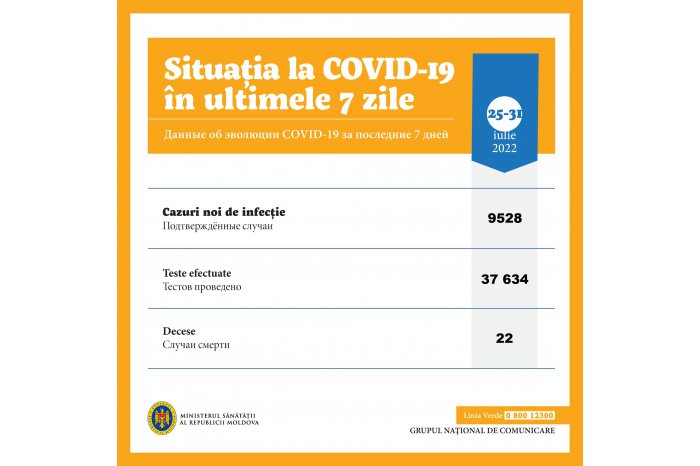 Chişinău, 2 aug. /MOLDPRES/. Ministerul Sănătății a anunțat că, în perioada 25-31 iulie, pe teritoriul țării au fost înregistrate 9528 de cazuri de infectare cu noul coronavirus, cu 3735 de cazuri mai mult decât în săptămâna precedentă, transmite MOLDPRES.