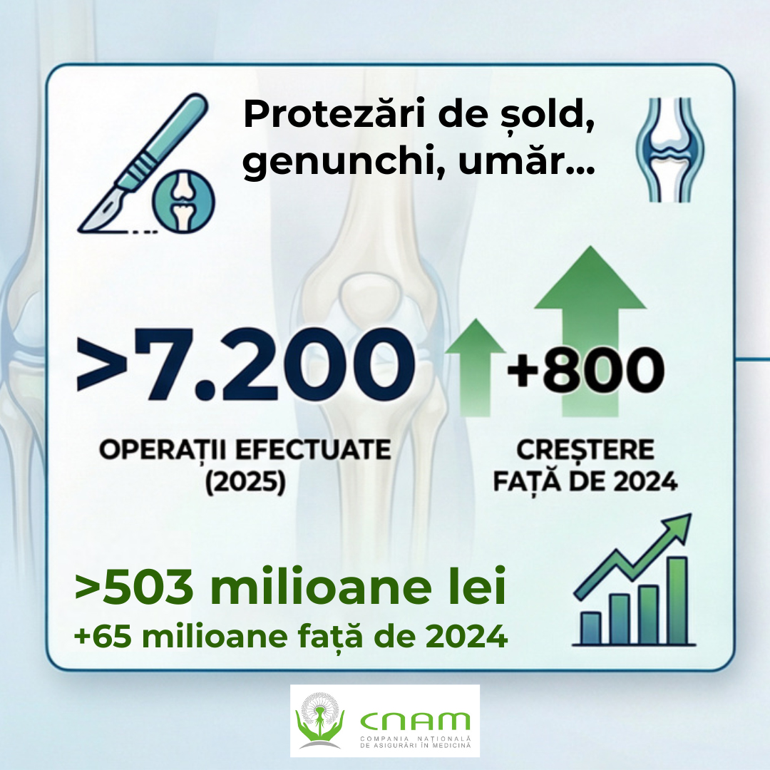Pentru aceste servicii, CNAM a alocat în 2025 peste 503 milioane de lei, în creștere cu 65 de milioane de lei față de anul precedent. Suplimentar, aproximativ 19,5 milioane de lei au fost direcționate pentru consumabile costisitoare utilizate în intervenții complexe, inclusiv cele de revizie la șold, genunchi și umăr.