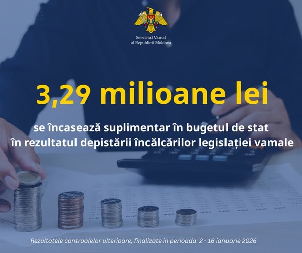 În urma controalelor finalizate în perioada 2–16 ianuarie 2026, Serviciul Vamal a identificat obligații vamale suplimentare în cuantum total de 3,29 milioane lei, care urmează să fie încasate la bugetul de stat, comunică MOLDPRES.