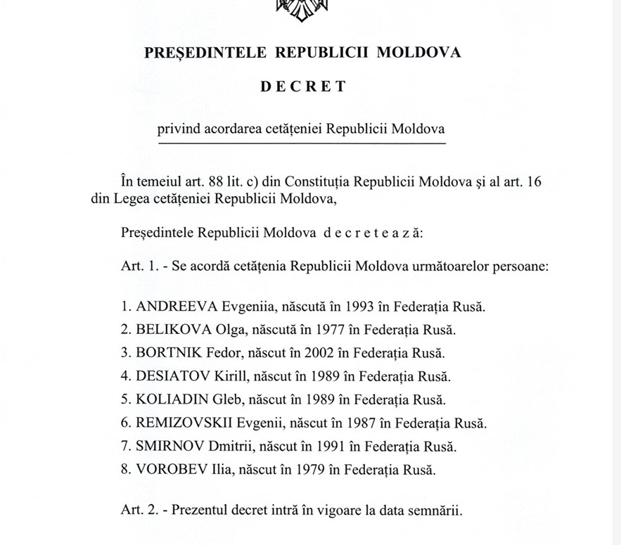 Opt cetățeni ruși au devenit oficial cetățeni ai Republicii Moldova. Un deceret în acest sens a fost semnat de președinta Maia Sandu pe 31 decembrie 2025, comunică MOLDPRES.