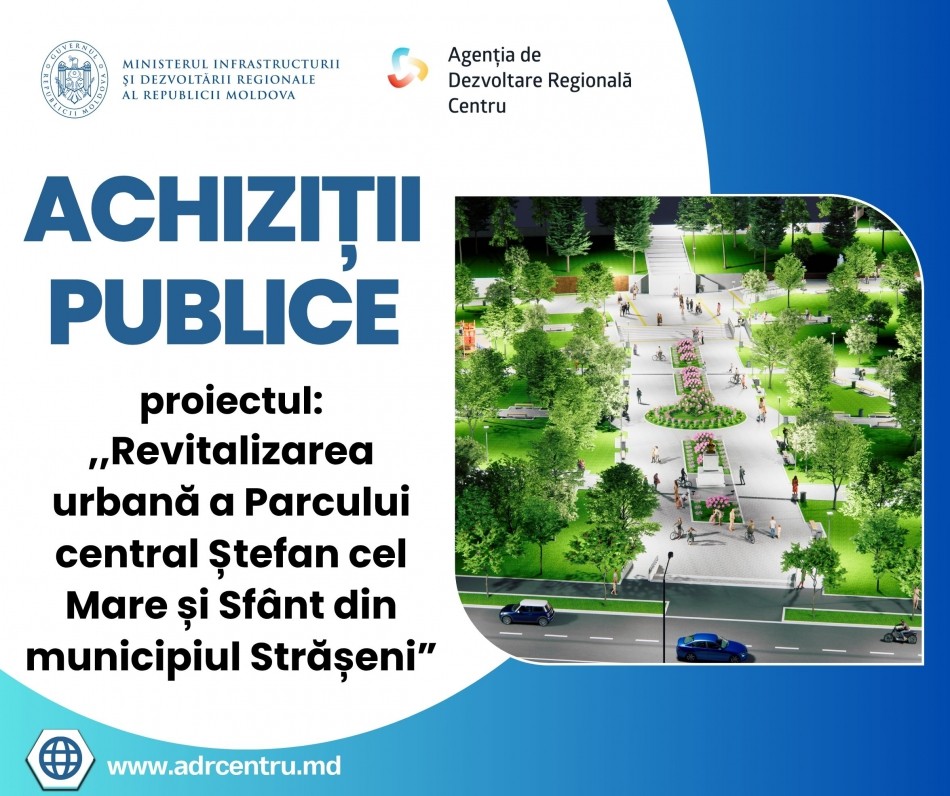 Agenția de Dezvoltare Regională (ADR) Centru a anunțat lansarea procedurii de achiziție publică pentru executarea lucrărilor de modernizare a Parcului central „Ștefan cel Mare și Sfânt” din municipiul Strășeni. Proiectul vizează transformarea acestui spațiu verde într-un punct de atracție modern, accesibil și prietenos, menit să îmbunătățească semnificativ calitatea vieții locuitorilor, transmite MOLDPRES.