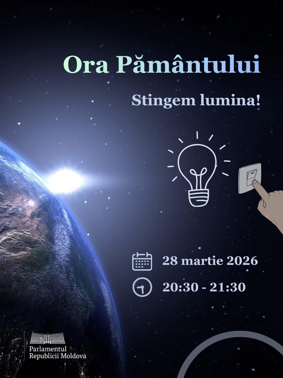 Parlamentul Republicii Moldova se alătură inițiativei globale Ora Pământului, prin stingerea luminilor timp de o oră, în seara zilei de astăzi, între orele 20:30 și 21:30, în semn de solidaritate cu oamenii din întreaga lume și în susținerea eforturilor de protejare a mediului, transmite MOLDPRES.