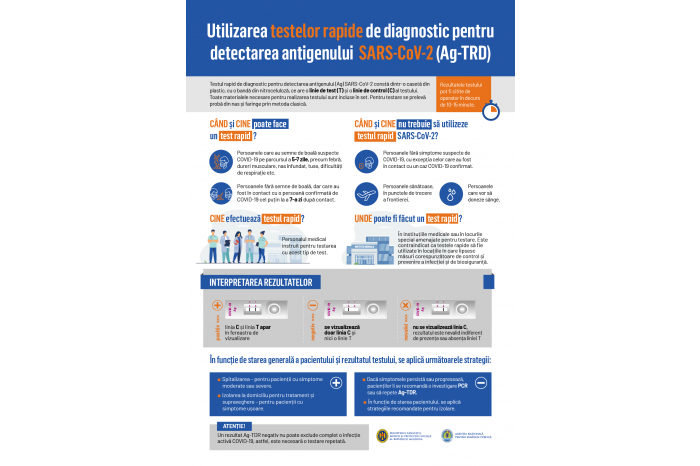 Testarea rapidă trebuie aplicată în primele zile de la debutul simptomelor. După această perioadă, rezultatul testului rapid trebuie ignorat, deoarece ar putea prezenta rezultate incorecte. În situația în care persoana prezintă simptome de COVID-19, iar testul rapid este negativ – este necesar să fie efectuat testul prin metoda PCR pentru confirmarea diagnozei.