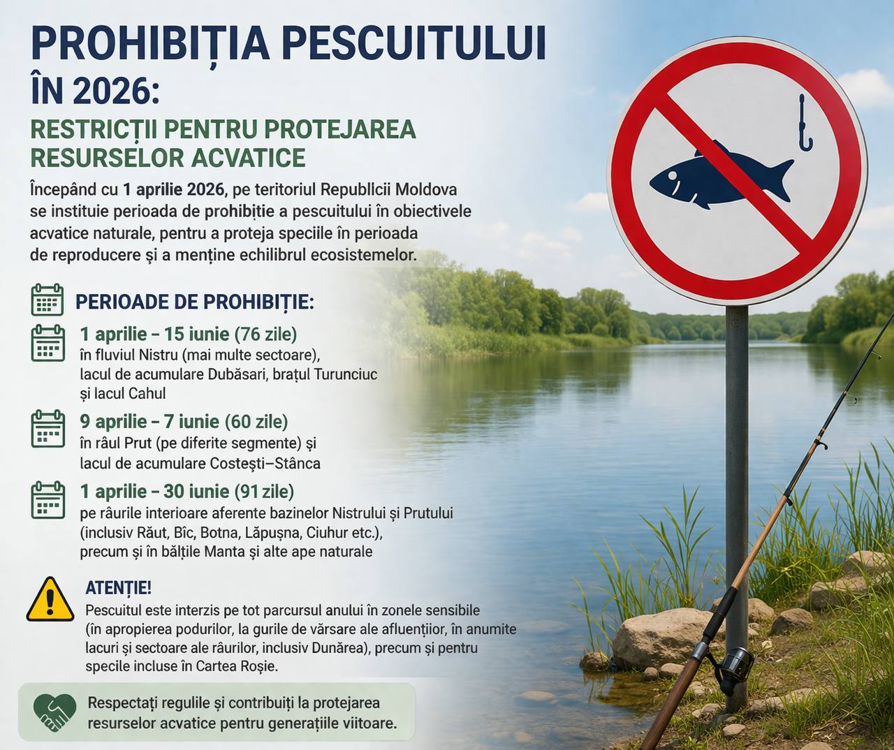 Râul Prut și lacul Costești-Stânca (60 de zile): Începând cu data de 9 aprilie și până la 7 iunie, interdicția se aplică pe diferite segmente ale râului Prut și în lacul de acumulare Costești-Stânca.