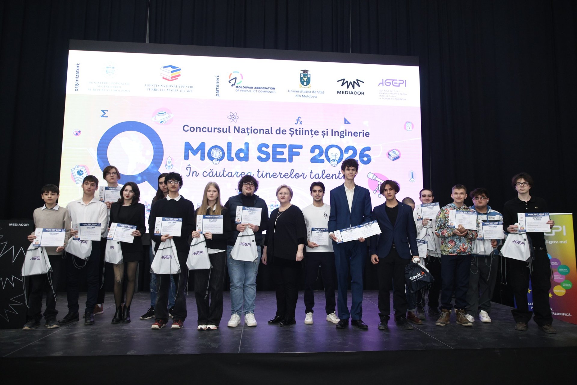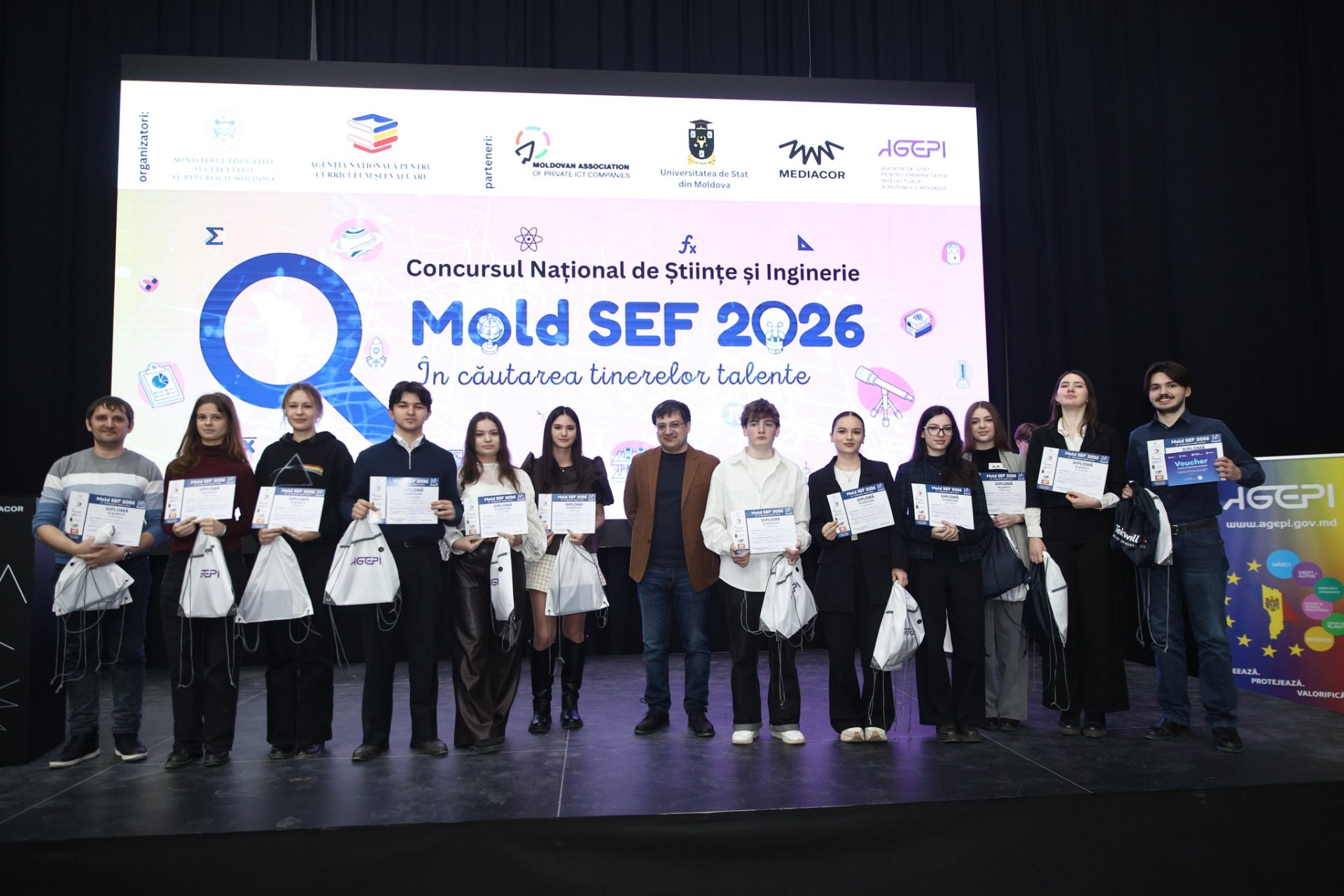 Un număr de 86 de proiecte, realizate de 143 de elevi care au fost îndrumați de 62 de profesori au fost înaintate la Concursul Național de Științe și Inginerie (Moldova Science and Engineering Fair - Mold SEF) 2026. Învingătorii competiției au fost premiați duminică, 15 februarie, în cadrul unui eveniment festiv desfășurat la Mediacor, informează MOLDPRES.