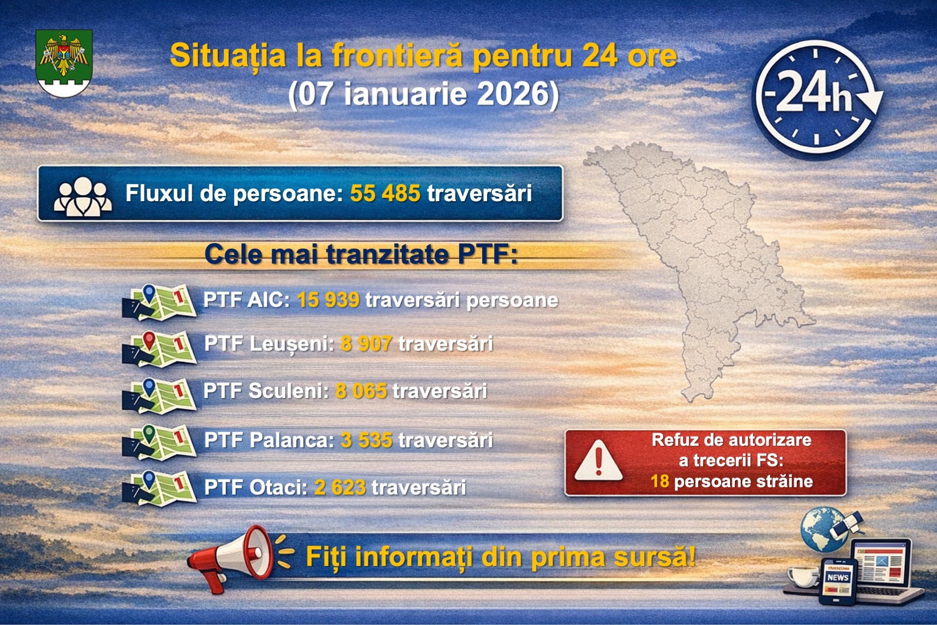 Punctele de trecere a frontierei au înregistrat, în ultimele 24 de ore, un flux total de 55.485 de traversări. Cele mai aglomerate rămân Aeroportul Internațional Chișinău (15.939 traversări), vamele Leușeni (8.907) și Sculeni (8.065), comunică MOLDPRES.