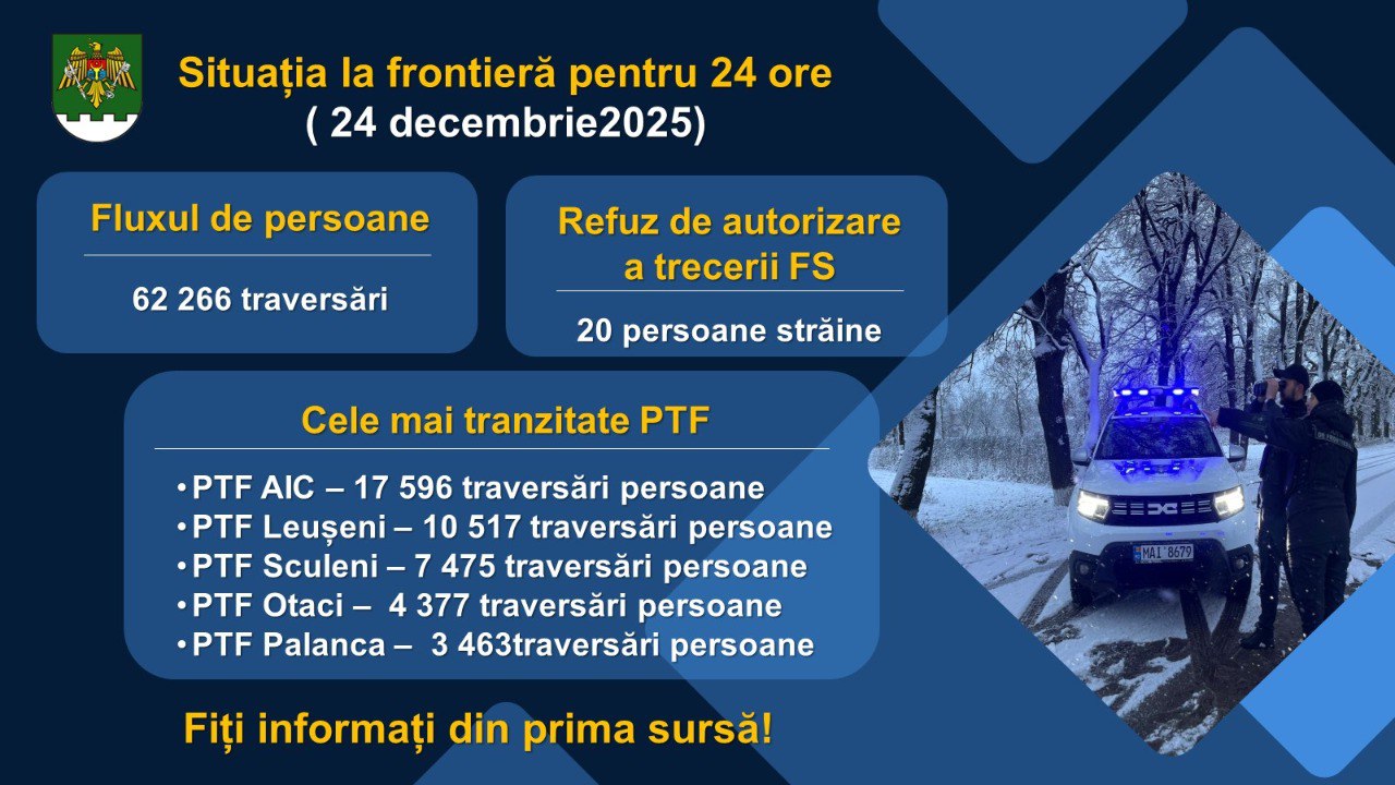 În perioada sărbătorilor de iarnă, atunci când mai mulți cetățeni din străinătate revin acasă, iar alții pleacă în vacanță, angajații Serviciului Vamal și Poliției de Frontieră activează în regim sporit și aplică un set de măsuri pentru fluidizarea traficului transfrontalier. Acțiunile sunt menite să gestioneze eficient fluxul de călători și mijloacele de transport.