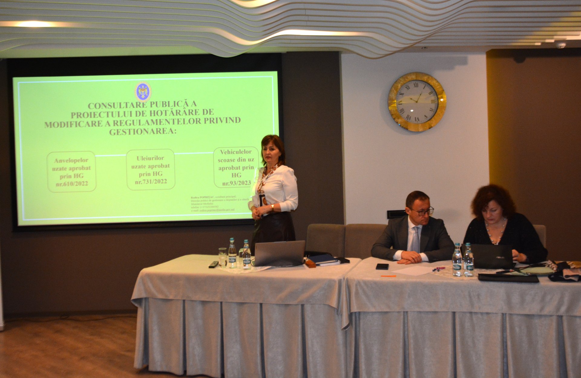 Ministerul Mediului a organizat astăzi audieri publice pentru a dezbate propunerile de modificare a regulamentelor privind gestionarea anvelopelor uzate, uleiurilor uzate și vehiculelor scoase din uz. Evenimentul a reunit experți, agenți economici și reprezentanți ai instituțiilor de mediu, transmite MOLDPRES.
