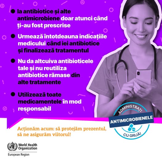 Pe parcursul săptămânii, în instituțiile medicale din întreaga țară vor avea loc instruiri pentru medici și farmaciști, sesiuni de informare pentru pacienți, campanii în școli și activități comunitare dedicate utilizării corecte a antimicrobienelor. ANSP va publica recomandări actualizate privind prescrierea antibioticelor, iar OMS va sprijini autoritățile naționale în comunicarea mesajelor-cheie către populație.