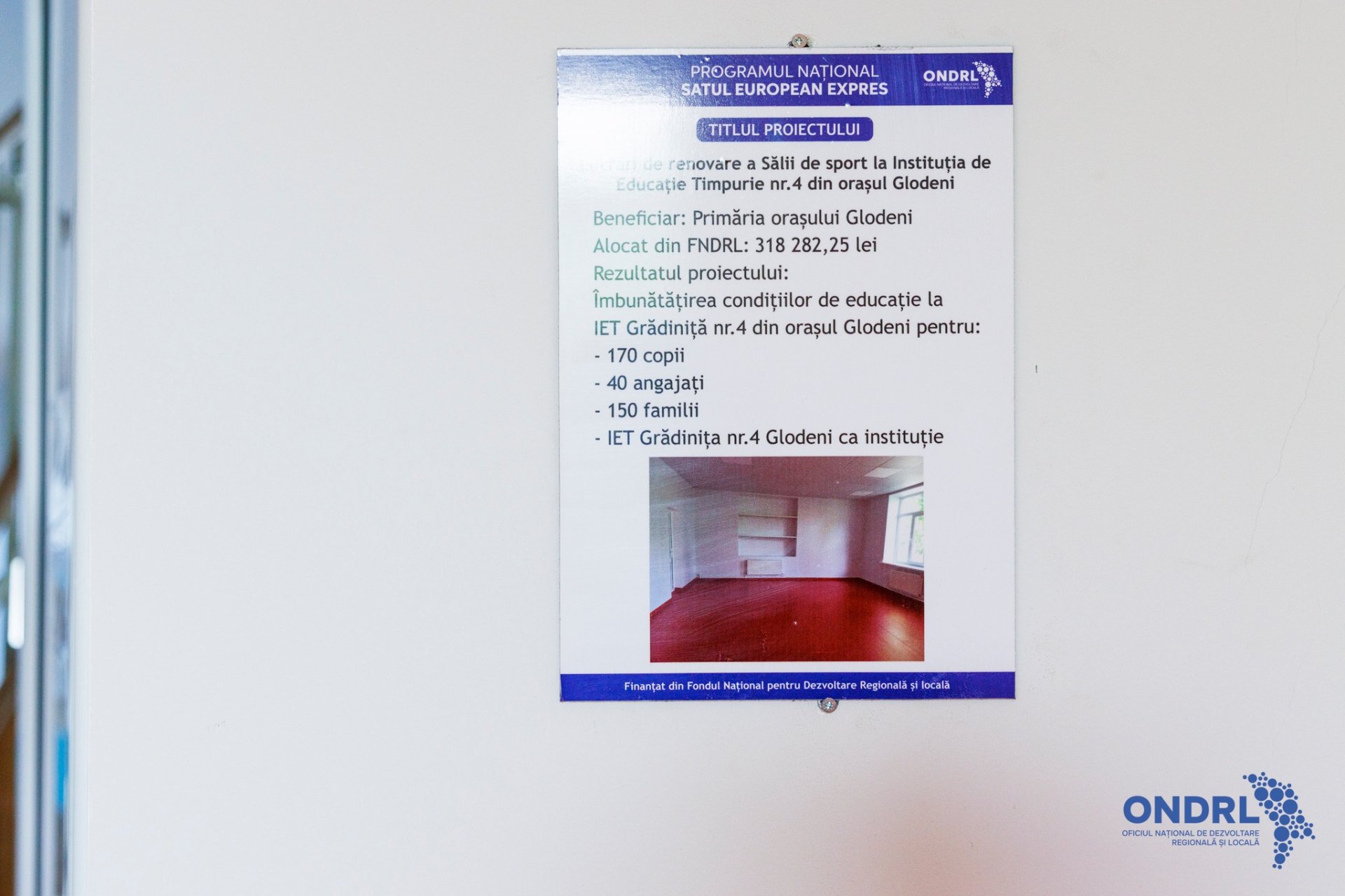 Prin Programul „Satul European Expres” a fost modernizată și sala de sport de la Grădinița nr. 4, cu o investiție de aproximativ 320.000 lei. Noile dotări includ pardoseli și finisaje interioare moderne, iar beneficiarii direcți sunt 170 de copii și 40 de angajați.