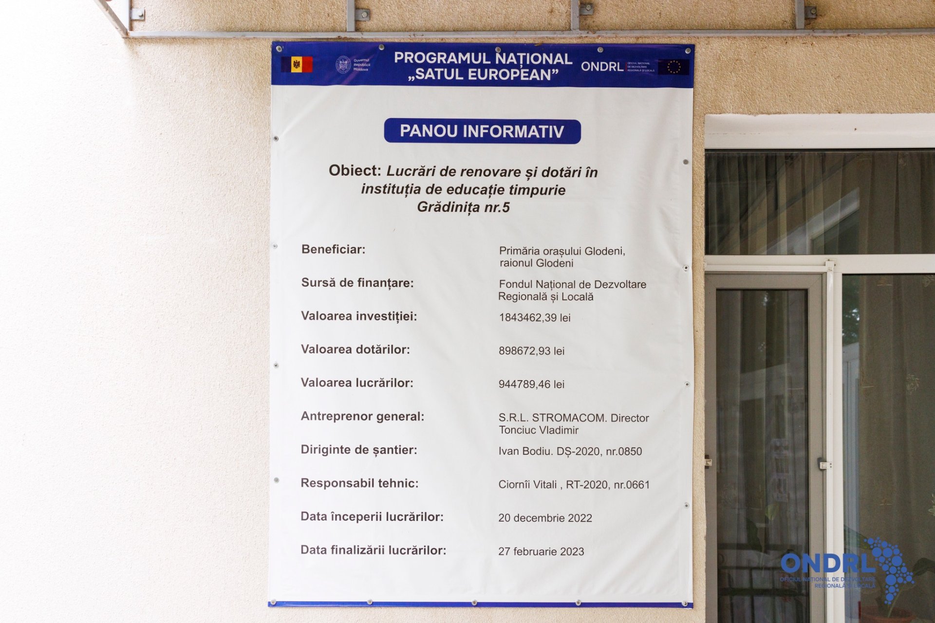 Anterior, prin ediția I a Programului „Satul European”, la Grădinița nr. 5 a fost implementat proiectul de renovare a clădirii, inclusiv reconstrucția acoperișului pe o suprafață de 1.236 m² și dotarea instituției cu echipamente și mobilier. Investiția totală a fost de circa 1,85 milioane lei, beneficiind 350 de copii și 52 de angajați.