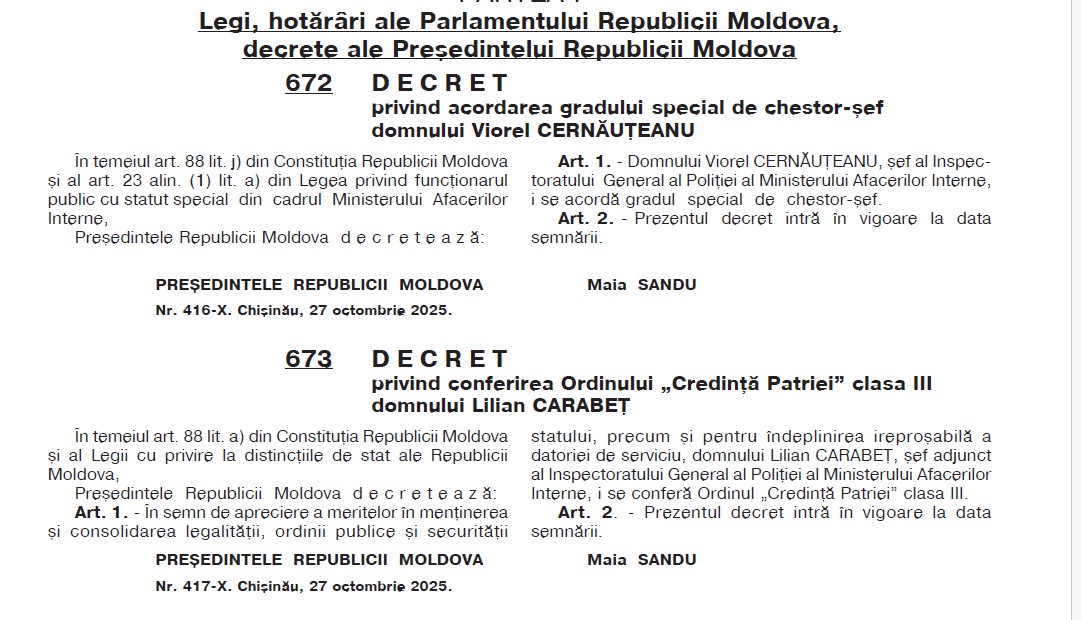 În același număr al Monitorului Oficial a fost publicat și decretul prin care Lilian Carabeț, șef adjunct al Inspectoratului General al Poliției, i s-a conferit Ordinul „Credință Patriei”, clasa III, în semn de apreciere a meritelor sale în menținerea ordinii publice și securității statului, precum și pentru îndeplinirea ireproșabilă a datoriei de serviciu.