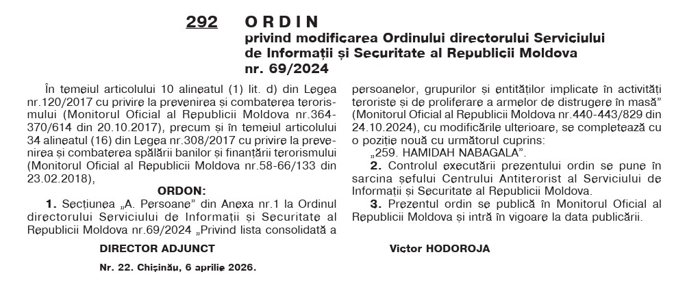 Serviciul de Informații și Securitate (SIS) a actualizat lista persoanelor, grupurilor și entităților implicate în activități teroriste și de proliferare a armelor de distrugere în masă. Modificarea a fost operată printr-un ordin semnat la 6 aprilie 2026 și publicat în numărul de astăzi al Monitorului Oficial, comunică MOLDPRES.