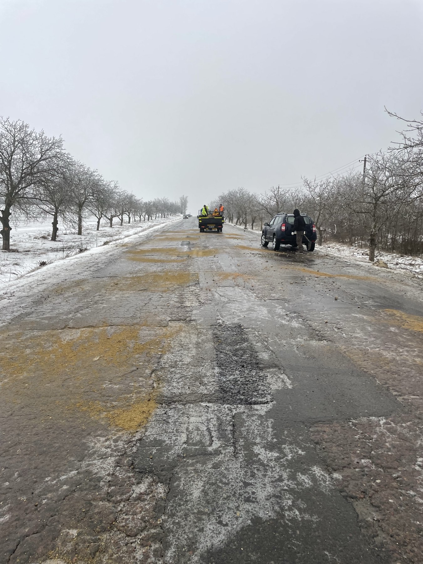Drumarii se află în teren și intervin permanent pentru menținerea siguranței circulației, însă poleiul se formează continuu din cauza precipitațiilor.