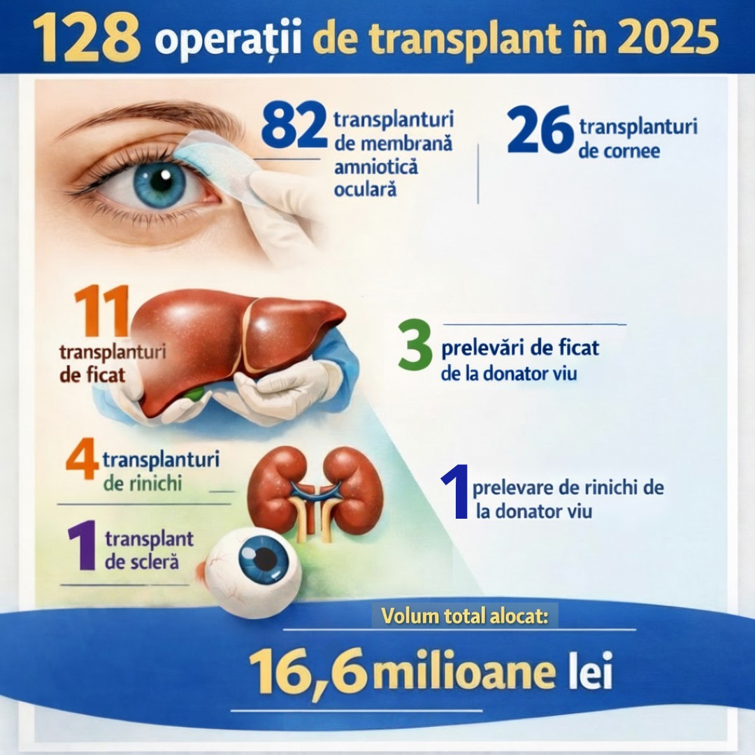 Potrivit instituției, dintre intervențiile efectuate, 11 au fost transplanturi de ficat, patru de rinichi și 26 de cornee. Totodată, medicii au realizat 82 de transplanturi de membrană amniotică pe suprafața oculară, un transplant de scleră, trei prelevări de ficat de la donatori vii și o prelevare de rinichi de la donator viu.