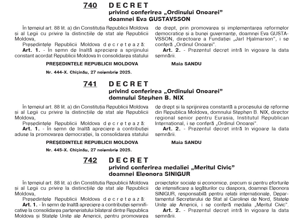 Președinta Republicii Moldova, Maia Sandu, a conferit distincții de stat unor personalități internaționale care au sprijinit în mod constant procesele democratice, reformele și cooperarea externă a țării. Decretele semnate de șefa statului au fost publicate în Monitorul Oficial, comunică MOLDPRES.