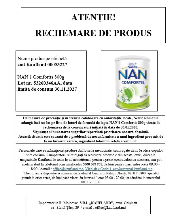 Un lot de lapte praf pentru bebeluși a fost rechemat din magazine. Decizia a fost anunțată astăzi de Agenția Națională pentru Siguranța Alimentelor (ANSA), transmite MOLDPRES.