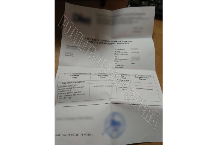 Potrivit datelor Inspectoratului General al Poliției de Frontieră, ieri, în punctul de trecere a frontierei Criva polițiștii au identificat în fluxul de călători un tânăr moldovean care revenea acasă din Ucraina. Pentru a nu fi plasat în autoizolare, bărbatul de 30 de ani a prezentat la controlul trecerii frontierei testul PCR Covid-19 negativ. În timpul cercetării documentului în cauză, inspectorului de frontieră i-a părut straniu că persoana a ieșit din Republica Moldova pe data de 21 martie, pe când testul era efectuat la Lvov (Ucraina) pe data de 20 martie. Astfel, verificările au fost extinse, iar ca rezultat testul s-a dovedit a fi falsificat.
