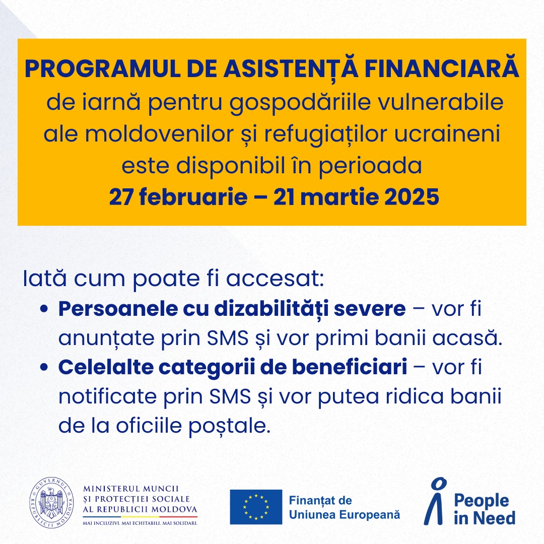 Beneficiarii unui program de ajutor, oferit familiilor vulnerabile în perioada rece a anului, pot ridica banii. Ajutorul financiar va fi distribuit în perioada 27 februarie – 21 martie 2025, transmite MOLDPRES.