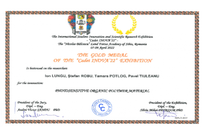 Lucrarea premiată cu medalia de aur, Photosensitive organic polymer material (autori Ion Lungu, Ștefan Robu, Tamara Potlog, Pavel Tiuleanu), a fost prezentată de către tânărul cercetător al Universităţii de Stat, Ion Lungu.