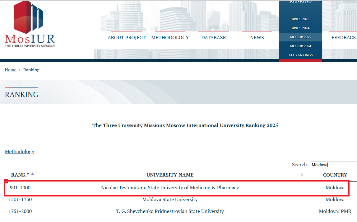 Universitatea de Stat de Medicină și Farmacie (USMF) „Nicolae Testemițanu” se menține pe locul 901-1000 în clasamentul internațional The Three University Missions (MosIUR) 2025, pentru al patrulea an consecutiv. Instituția universitară este lider printre cele trei instituții de învățământ superior din Republica Moldova prezente în acest clasament, informează MOLDPRES.