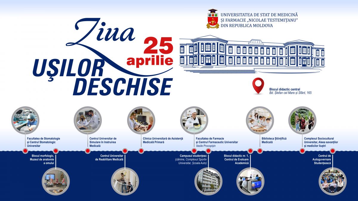 Universitatea de Stat de Medicină şi Farmacie (USMF) „Nicolae Testemiţanu” va organiza Ziua uşilor deschise – eveniment dedicat absolvenților de licee și colegii interesați de programe de studii în domeniul sănătății. Evenimentul va avea loc sâmbătă, 25 aprilie curent, începând cu ora 9:00, la Blocul didactic central aflat pe bd. Ștefan cel Mare și Sfânt, 165, din capitală, informează MOLDPRES.