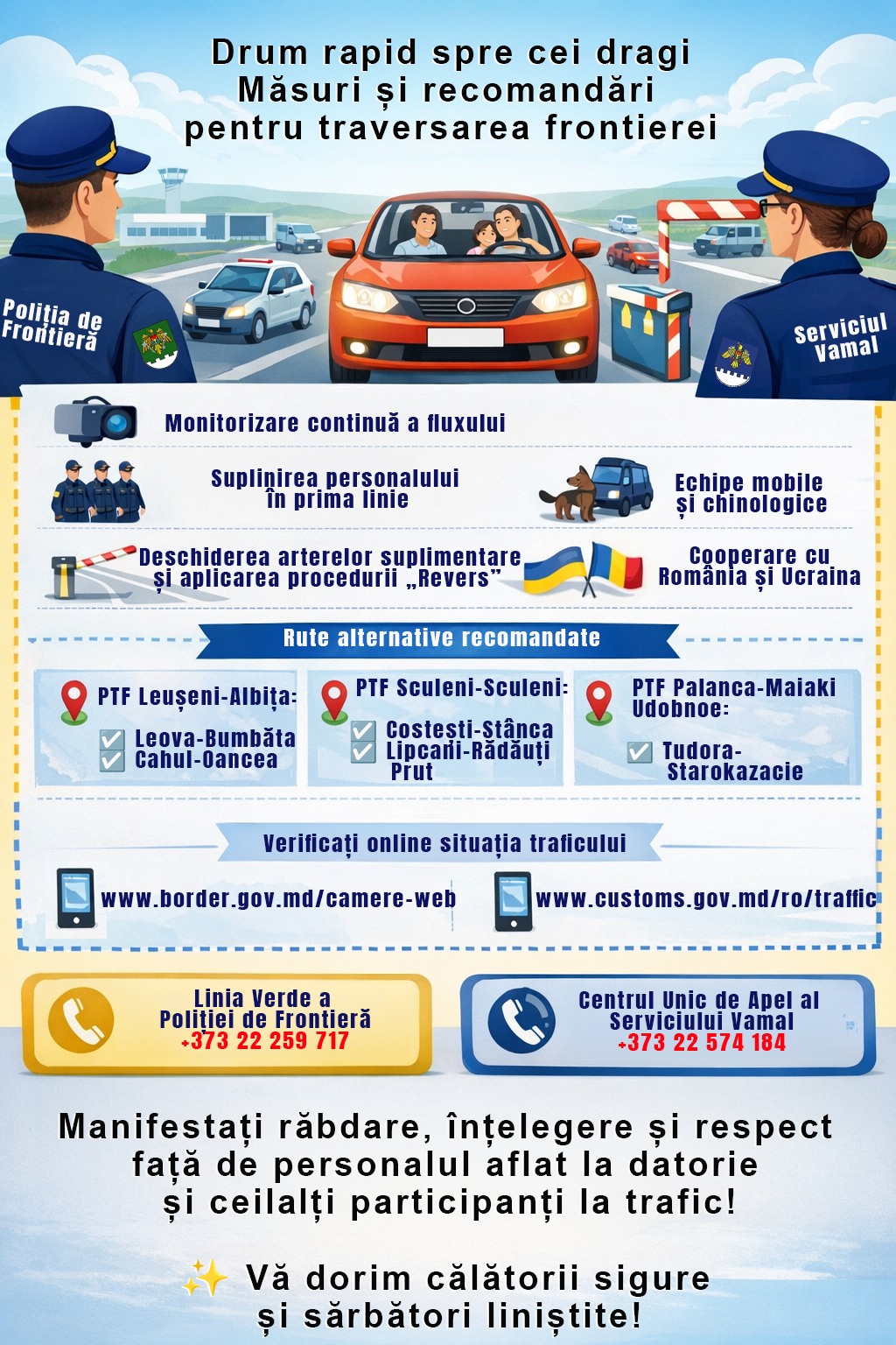 „Avem o colaborare bună cu autoritățile de frontieră din România și aceleași măsuri vor fi aplicate pe ambele părți. Îndemnăm cetățenii să verifice situația punctelor de trecere în regim live și să aleagă ruta mai puțin aglomerată”, a adăugat șeful Poliției de Frontieră.