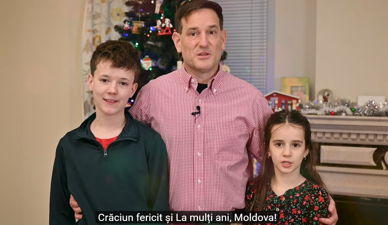 Însărcinatul cu afaceri al Ambasadei SUA, Nick Pietrowicz, a adresat felicitări moldovenilor alături de cei doi copii ai săi, subliniind că sărbătoarea Crăciunului amintește de valorile care contează cu adevărat: familia, credința și libertatea.