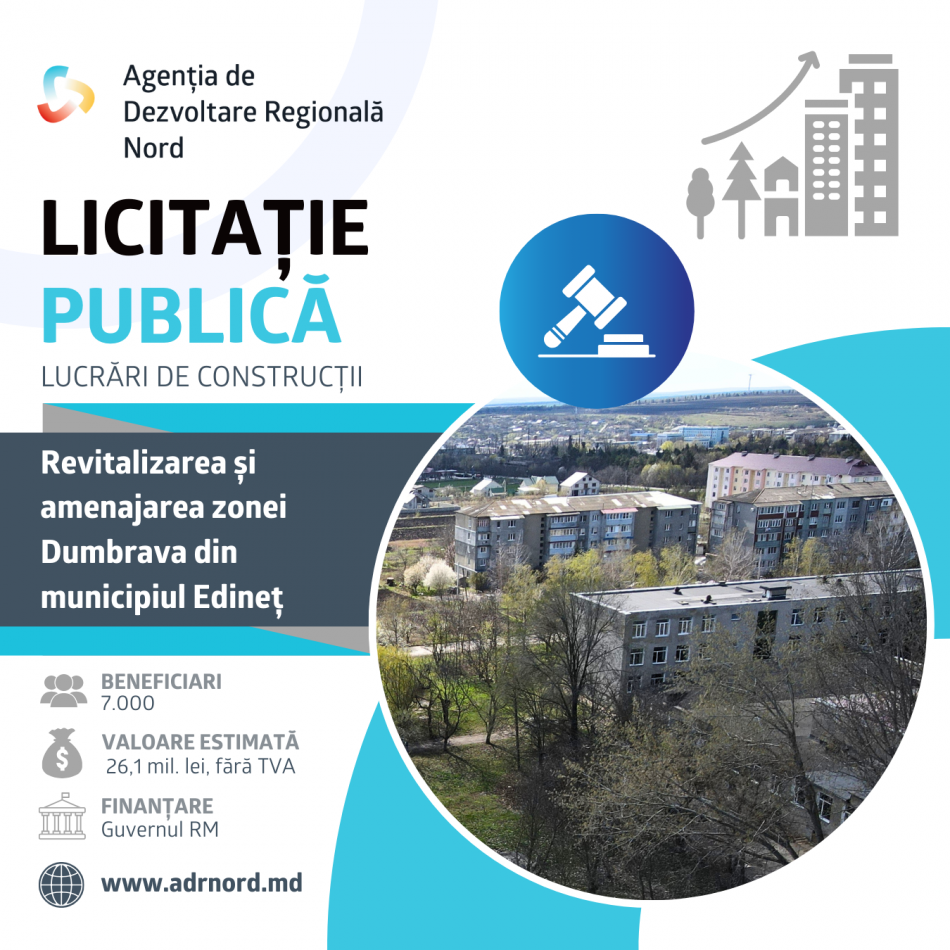 Agenția de Dezvoltare Regională (ADR) Nord a lansat procedura de licitație publică pentru executarea lucrărilor de construcții în cadrul proiectului „Revitalizarea și amenajarea zonei Dumbrava din municipiul Edineț”, un proiect major care vizează regenerarea unei zone urbane degradate și îmbunătățirea calității vieții locuitorilor, transmite MOLDPRES.