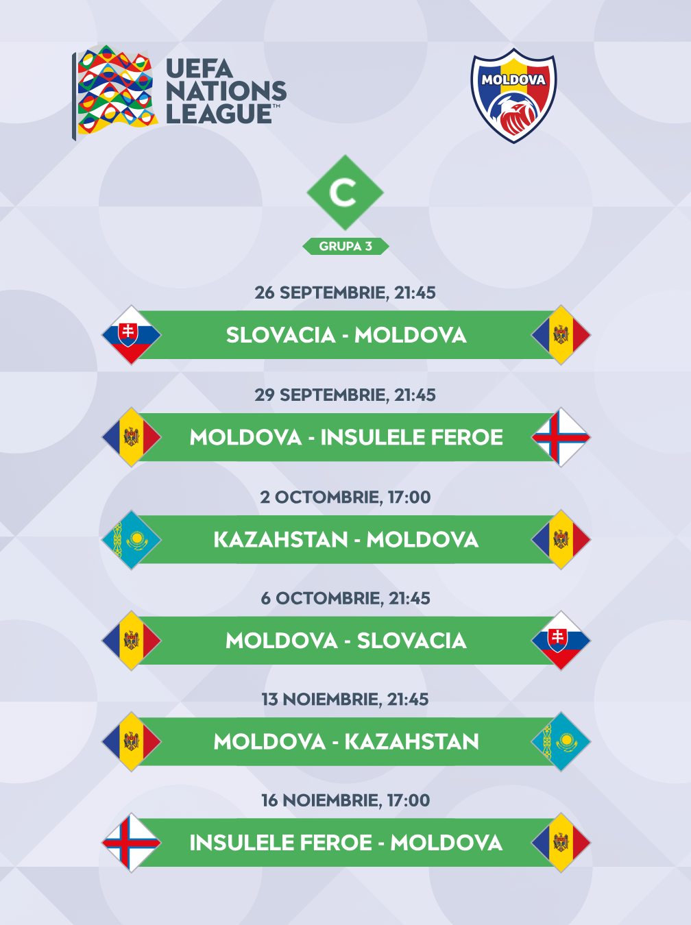 Echipa națională de fotbal a R. Moldova și-a aflat adversarele din Liga C a UEFA Nations League în urma tragerii la sorți care a avut loc la Buxelles joi, 12 februarie. ,,Tricolorii" se vor duela în Grupa C3 cu Kazahstan, Slovacia și Insulele Feroe, informează MOLDPRES.
