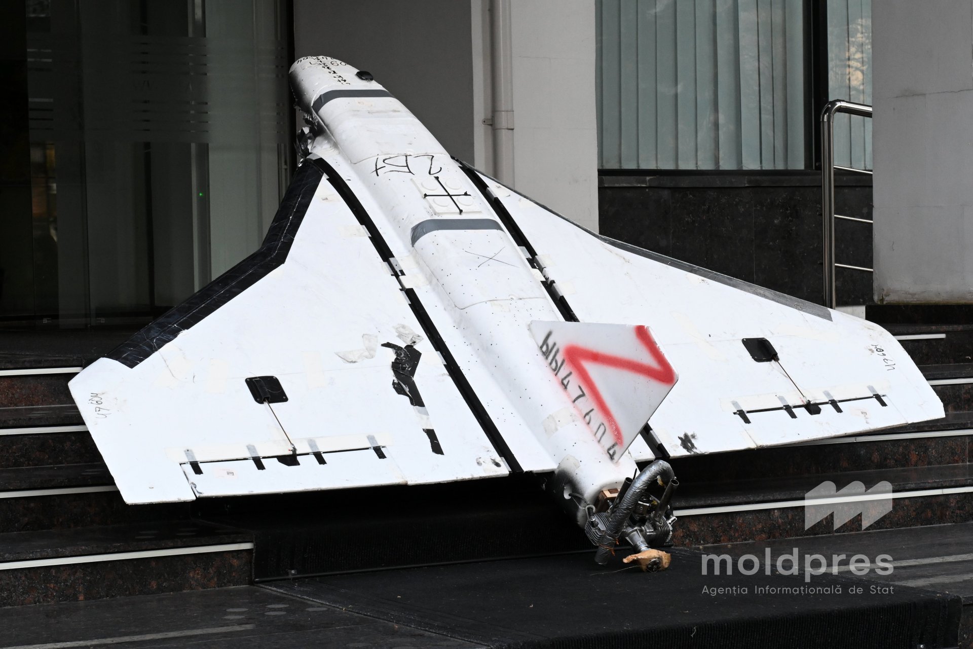 VIDEO, FOTO // Drona „Gerbera”, prăbușită în raionul Florești, expusă în fața MAE. Ambasadorul agreat al Rusiei a primit încă o notă de protest