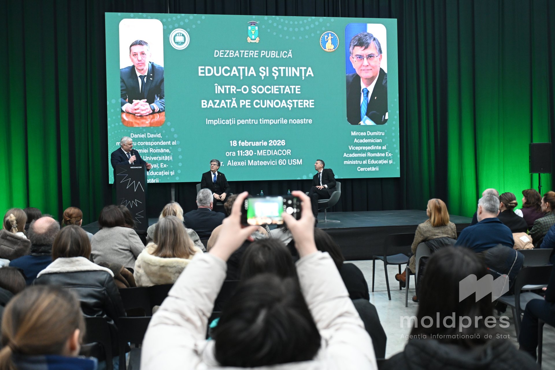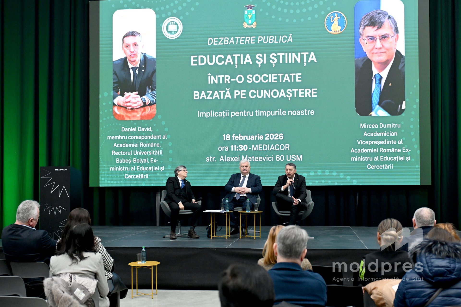 Igor Șarov, rectorul USM: „Importanța acestor prelegeri nu poate fi subestimată. Cei doi academicieni români, foști miniștri ai Educației și Cercetării, sunt personalități consacrate la nivel mondial. Tematica selectată pentru prelegerile susținute la USM și dezbaterea publică de astăzi nu a fost una întâmplătoare. A fost o discuție binevenită în condițiile unui război hibrid, în condițiile în care se află astăzi Republica Moldova. Atunci când vorbim despre știință versus pseudoștiință, accentele care au fost puse de Daniel David și Mircea Dumitru au trezit un interes foarte mare în rândul tinerilor studenți, cercetători, profesori ai USM”.