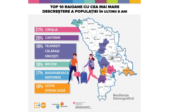 Chişinău, 24 aug. /MOLDPRES/. Fondul Națiunilor Unite pentru Populație (UNFPA) Moldova a publicat ieri un top a zece raioane din Republica Moldova cu cea mai mare descreștere a populației în ultimii opt ani, transmite MOLDPRES.