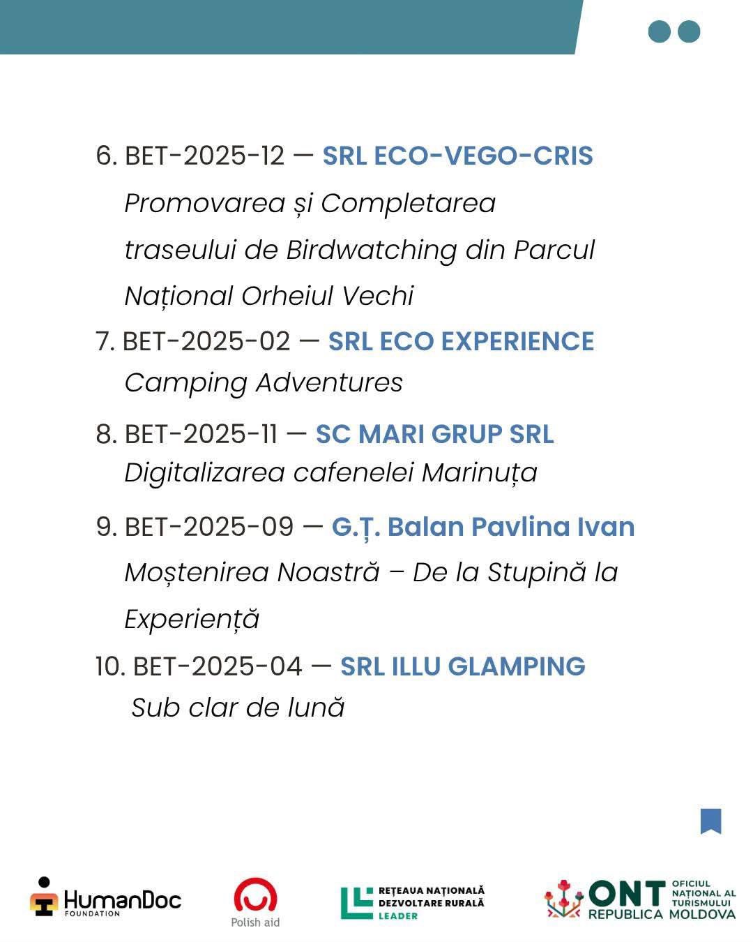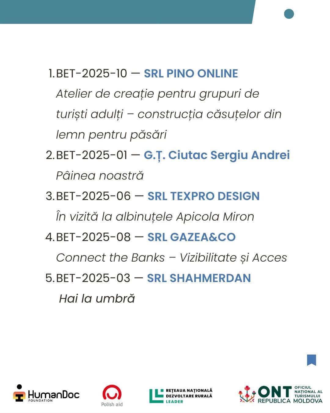 Cele zece proiecte selectate acoperă o gamă largă de experiențe turistice — de la meșteșuguri tradiționale și gastronomie locală, până la aventuri în natură și turism apicol. Printre acestea se numără: Atelier de creație pentru turiști – construcția căsuțelor din lemn pentru păsări (SRL PINO ONLINE); Pâinea noastră – experiență culinară locală (G.Ț. Ciutac Sergiu Andrei); În vizită la albinuțele Apicola Miron (SRL TEXPRO DESIGN); Connect the Banks – Vizibilitate și Acces (SRL GAZEA&CO); Hai la umbră (SRL SHAHMERDAN); Traseu de birdwatching în Parcul Național Orheiul Vechi (SRL ECO-VEGO-CRIS); Camping Adventures (SRL ECO EXPERIENCE); Digitalizarea cafenelei Marinuța (SC MARI GRUP SRL); Moștenirea Noastră – De la Stupină la Experiență (G.Ț. Balan Pavlina Ivan); Glamping sub clar de lună (SRL ILLU GLAMPING).