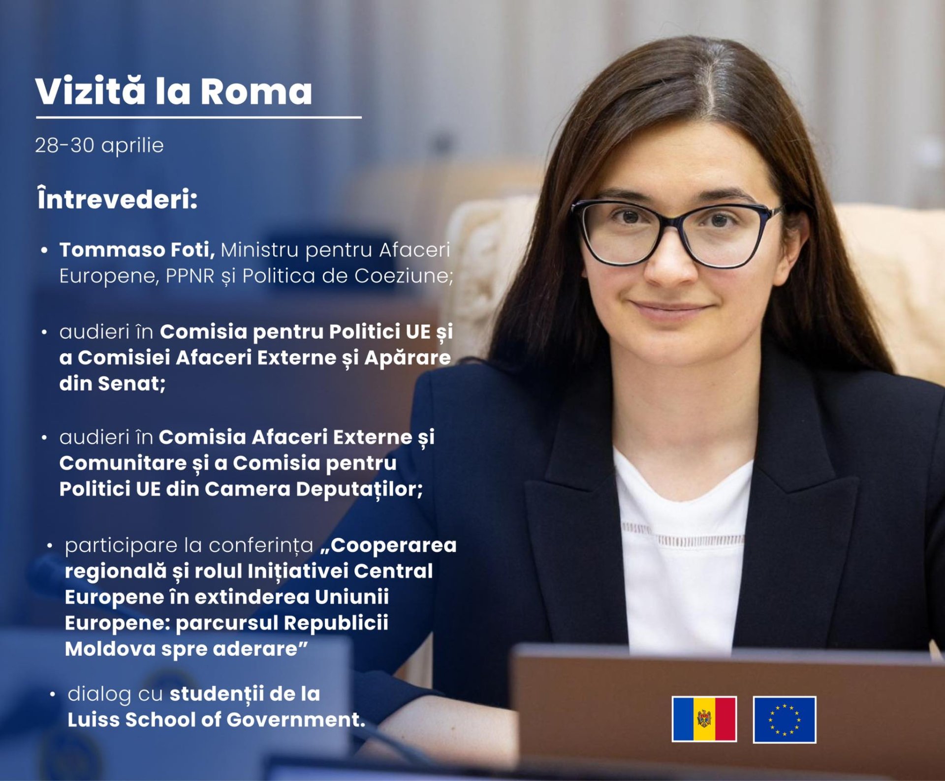 Viceprim-ministrul pentru Integrare Europeană, Cristina Gherasimov, efectuează în perioada 28–30 aprilie o vizită de lucru la Roma, unde are programate întrevederi cu oficiali italieni și participări la evenimente dedicate integrării europene, transmite MOLDPRES.