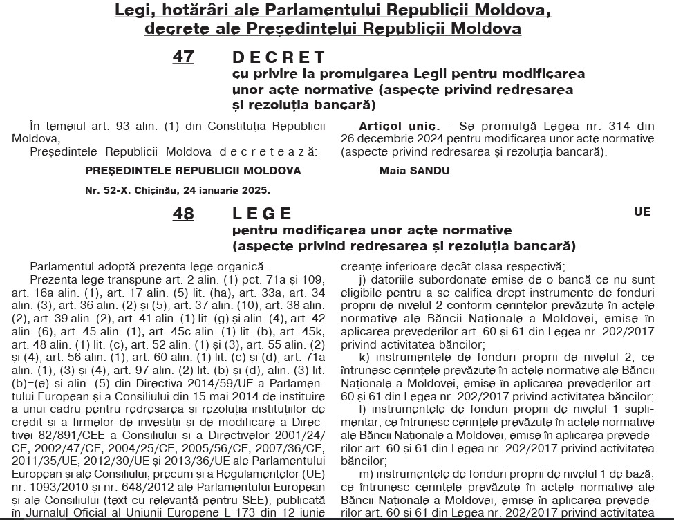 Указ о промульгации и закон о внесении изменений в некоторые нормативные акты (аспекты, касающиеся оздоровления банков и банковской резолюции) опубликованы в сегодняшнем номере Monitorul Oficial, передает МОЛДПРЕС.